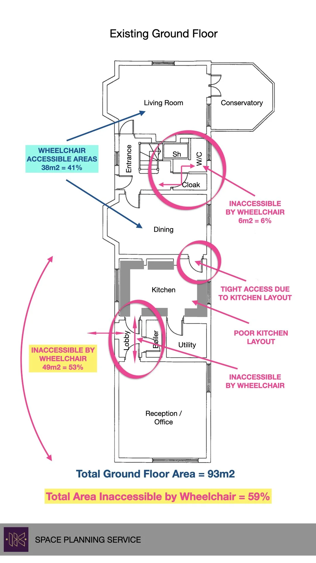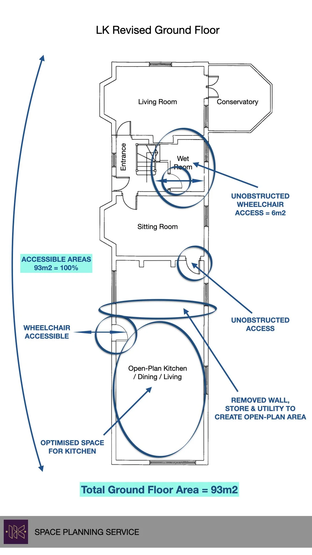 To enable the client to take advantage of the home’s exceptionally large ground floor area, and be fully accessible by wheelchair, the entire ground floor layout was redesigned into a fully functional and useable space. As it stood, only 40% of the ground floor was wheelchair accessible. The remaining 60% was redesigned into a large open-plan kitchen, living and dining area, and the existing shower and cloak room areas were converted into a large walk-in shower room. As the structural alterations fell within the building’s existing footprint, this work did not require planning permission.